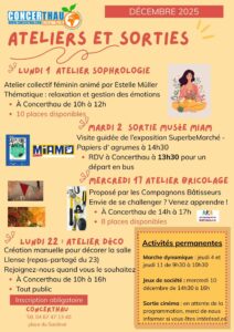 - Sorties culturelles décembre 2025Décembre à Concerthau : ateliers & sorties ! Un mois plein de découvertes, de détente et de créativité vous attend 🧘♀️ Lundi 1er – Atelier SophrologieUn moment pour soi, animé par Estelle Müller : relaxation & gestion des émotions.⏰ 10h–12h • 10 places dispo 🎨 Mardi 2 – Sortie Musée MIAMVisite guidée de l’exposition SuperbeMarché… Lire la suite : Sorties culturelles décembre 2025